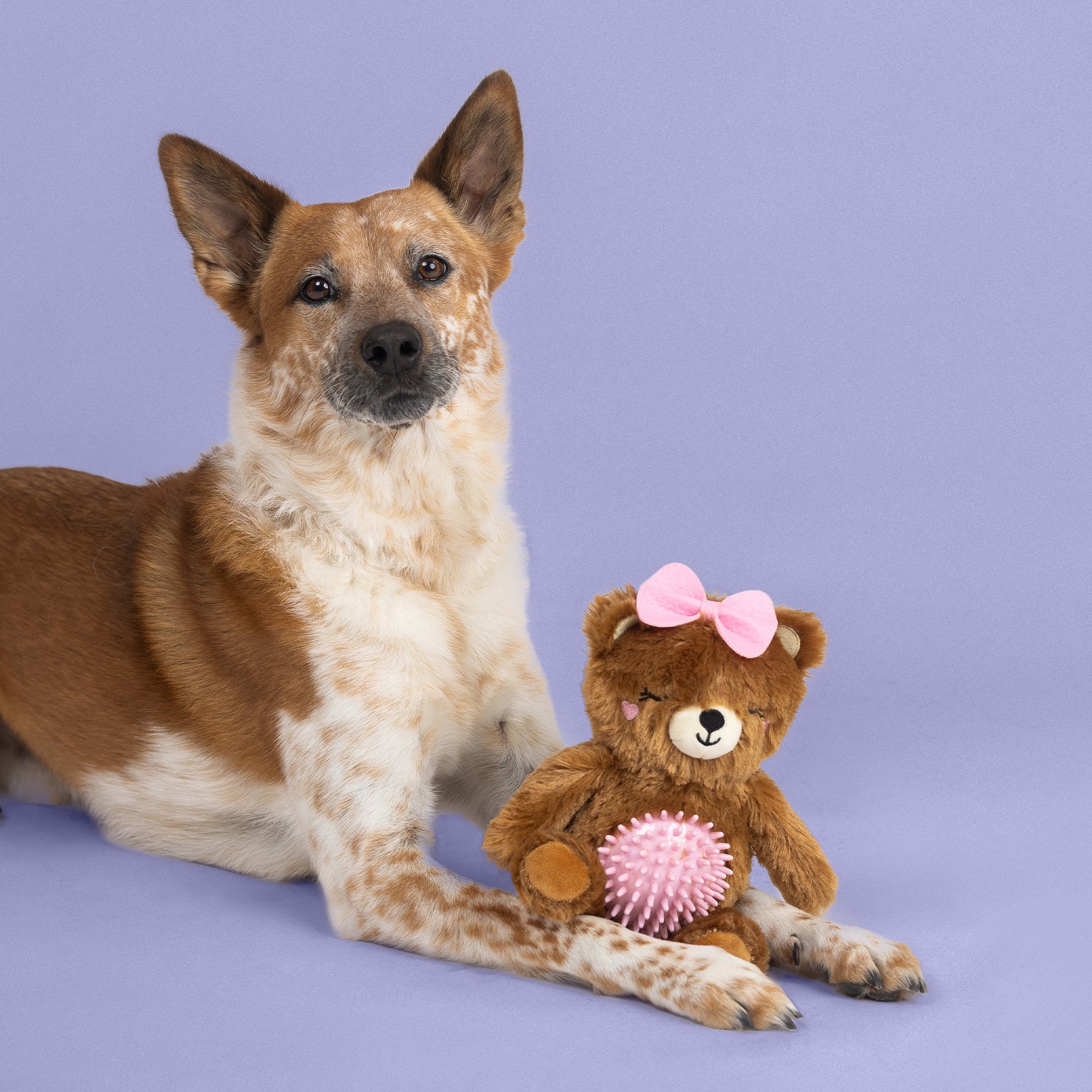 Un-bear-lieveably cute! Our “Be My Cuddle Buddy?” plush toy is perfect for playtime, anytime. Made with a super loud squeaker, crazy crinkle paper, and a unique spiky TPR ball exterior, this toy was made to make teeth cleaning fun and improve oral health. Designed with flexible bristles and ridges that clean teeth and massage gums, this furry friend is your pup's perfect match.